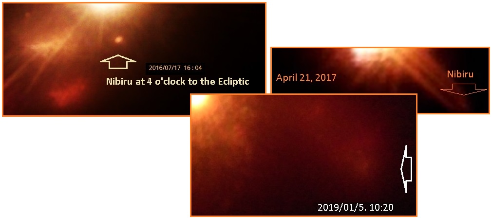 Временное локальное лунное затмение, произошедшее из-за неосвещённой нефтяной массы, было именно таким случаем. Это затмение не было всеобщим, его можно было наблюдать только локально, так как масса находилась близко к Земле. Красная пыль придаёт горящей нефти красный цвет, но смесь красного и синего может дать зелёный цвет. Небесное свечение возникает, когда эта нефтехимия сгорает в верхних слоях атмосферы, создавая свечение от горизонта до горизонта. Теперь, когда Нибиру находится прямо перед Солнцем, солнечный свет проникает сквозь огромное пылевое облако и частично освещает комплекс Нибиру.